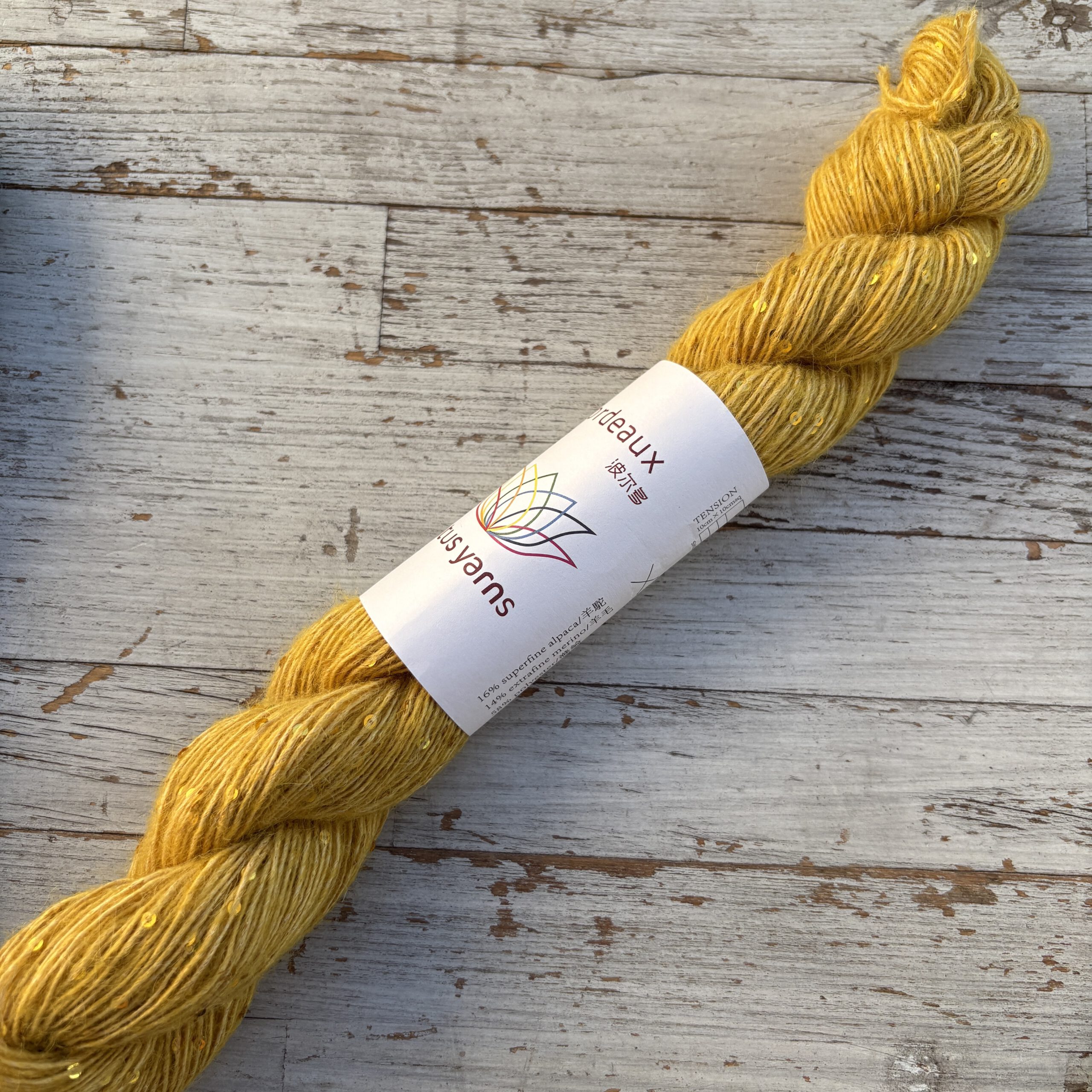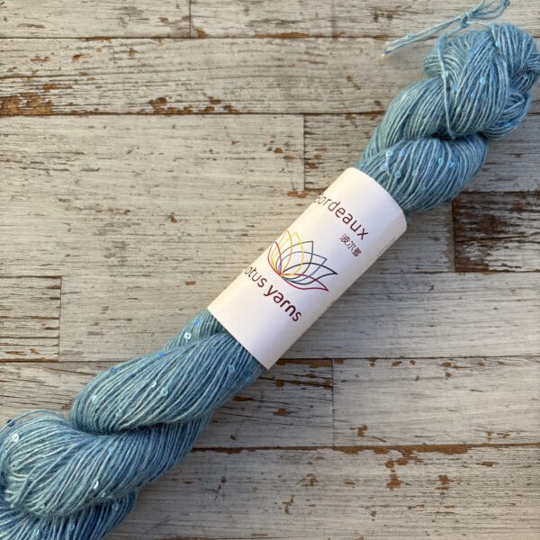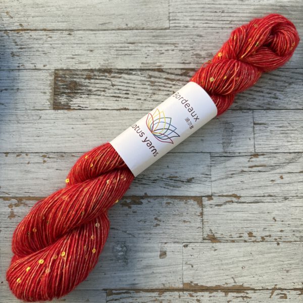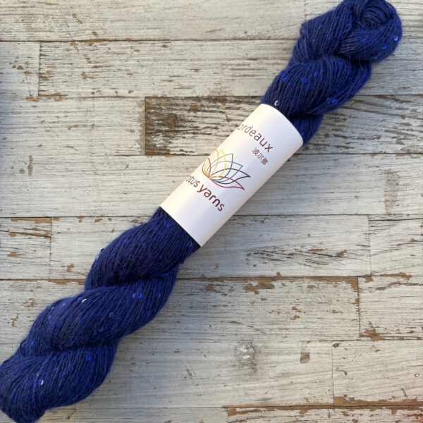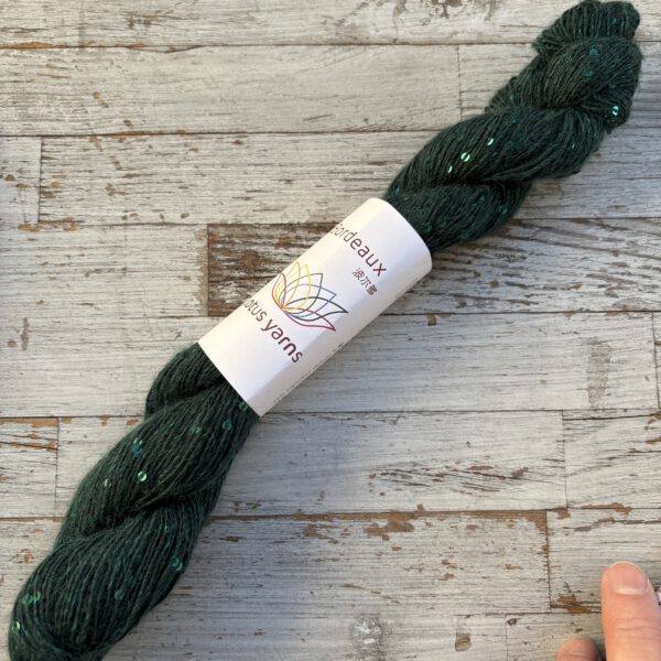 Ganz unüblich für Lotus Yarns ist BORDEAUX, denn sie hat einen sehr hohen Synthetik-Anteil. Diese Qualtität hat einen synthetischen Trägerfaden, an dem die Pailletten befestigt sind. Darum herumgesponnen wird extrafeine Merinowolle und superfeines Alpaka. Dadurch wird die BORDEAUX wertig, ganz weich und sie kratzt nicht. Die Besonderheit: die vielen Pailletten im Garn sind farblich passend eingefärbt und geben ihm einen tollen, nicht zu aufdringlichen Effekt. Wenn es also um eine solche modische Qualität geht, kommt man an der Synthetik nicht vorbei. Dafür wird man mit einem ganz besonderen Strickstück belohnt, das voll im Trend liegt und phantastisch aussieht.